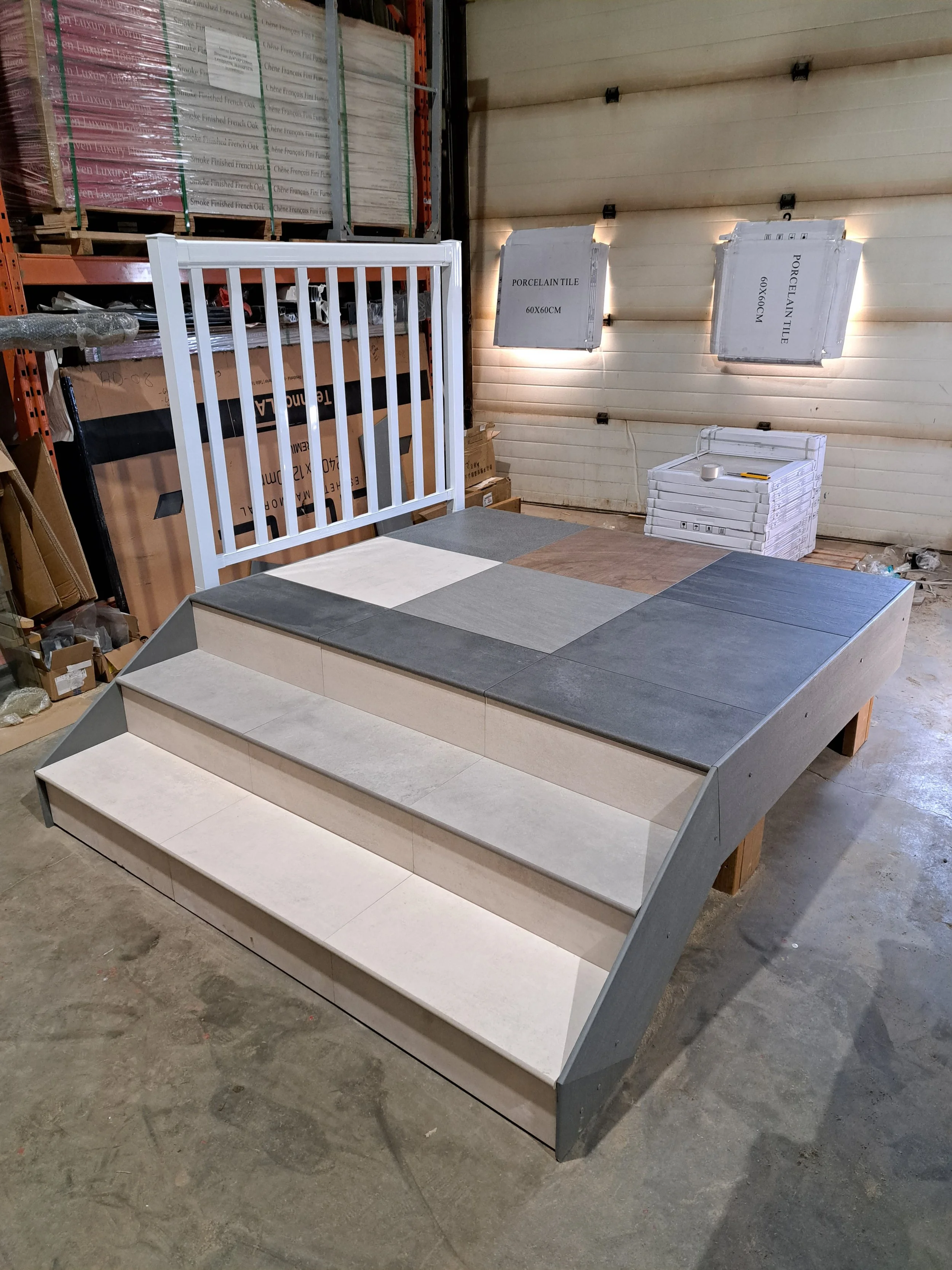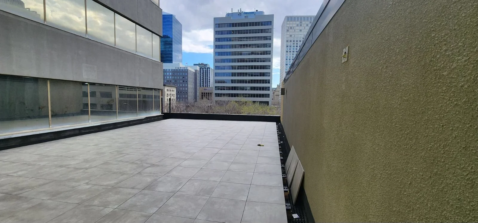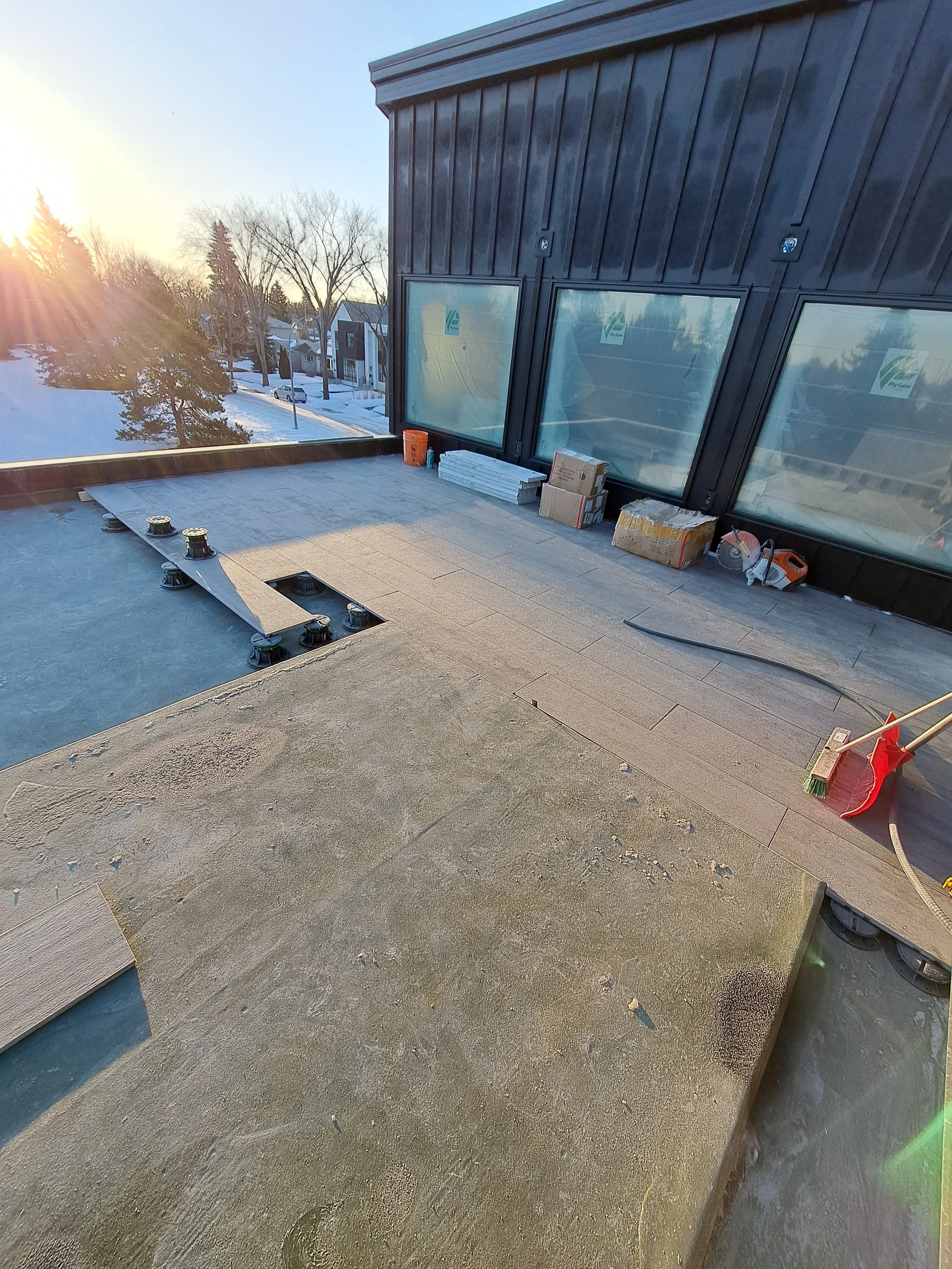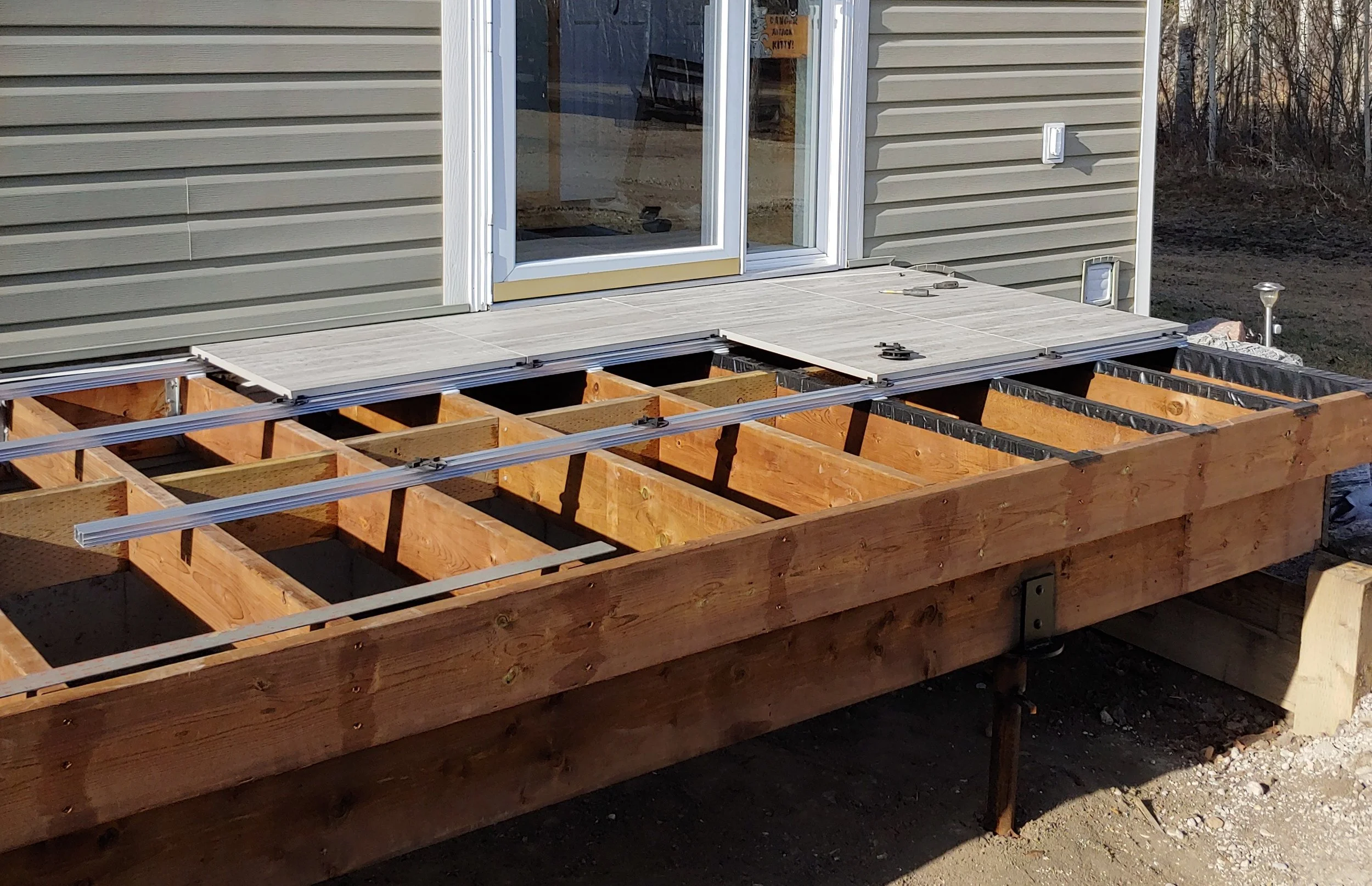 The wood frame deck should include an on-center spacing no larger than 400mm(16”) and typical construction practices consistent with standard wood or composite decking products. An aluminum rail is then installed perpendicular to the joist direction and spacers are inset into the rail based on the size of tile used. The layout of rails and spacers is project specific based on the shape and features the deck is designed with I.E. stair locations, direction and size of tile. There are a variety of finishing options for the edge based on desired aesthetic, the final system needs to include a fixed material border or bonded exterior row to prevent the inner tiles from horizontal movement